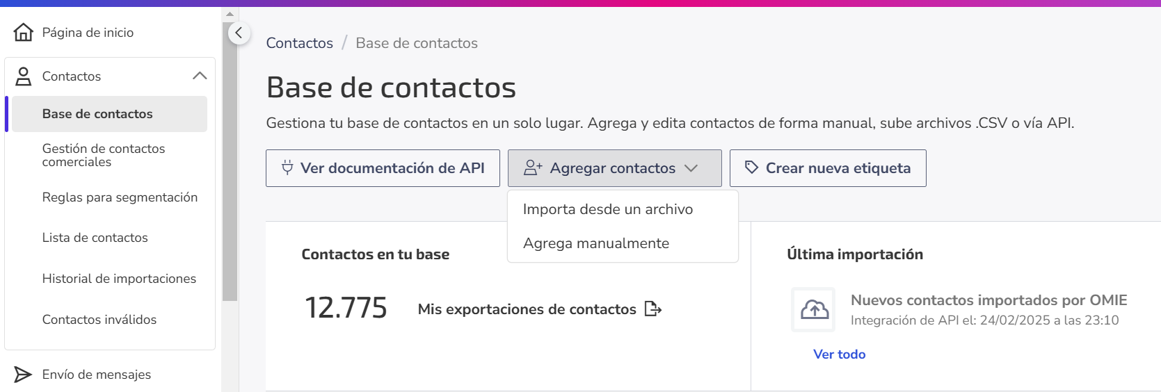 Accede a Contactos > Listas de contactos y haz clic en Agregar contactos > Agrega manualmente. - Mediante la importación de un archivo: