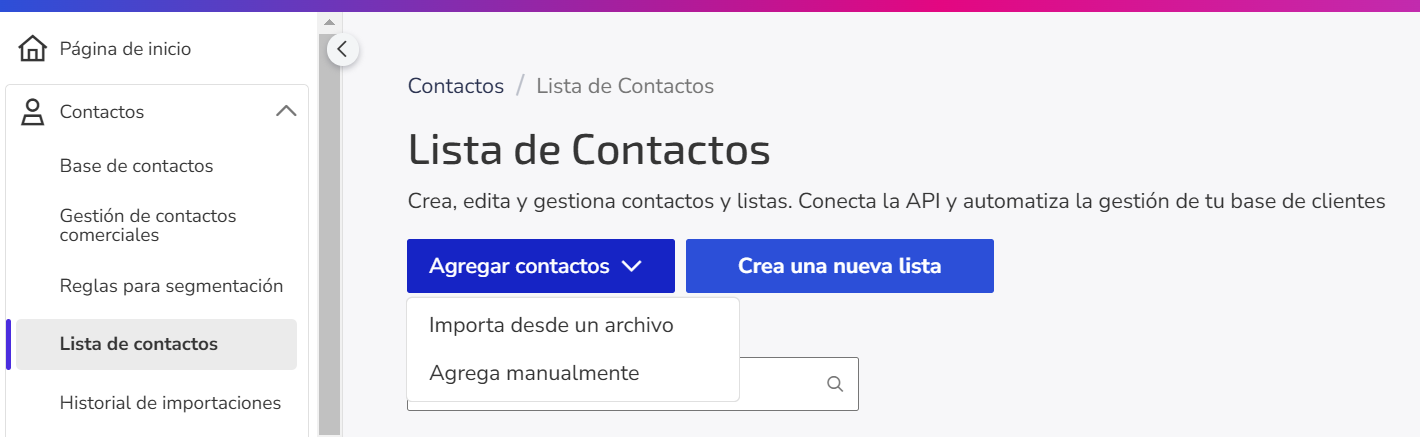 Accede a Contactos > Listas de contactos y haz clic en Agregar contactos > Agrega manualmente. - Mediante la importación de un archivo: