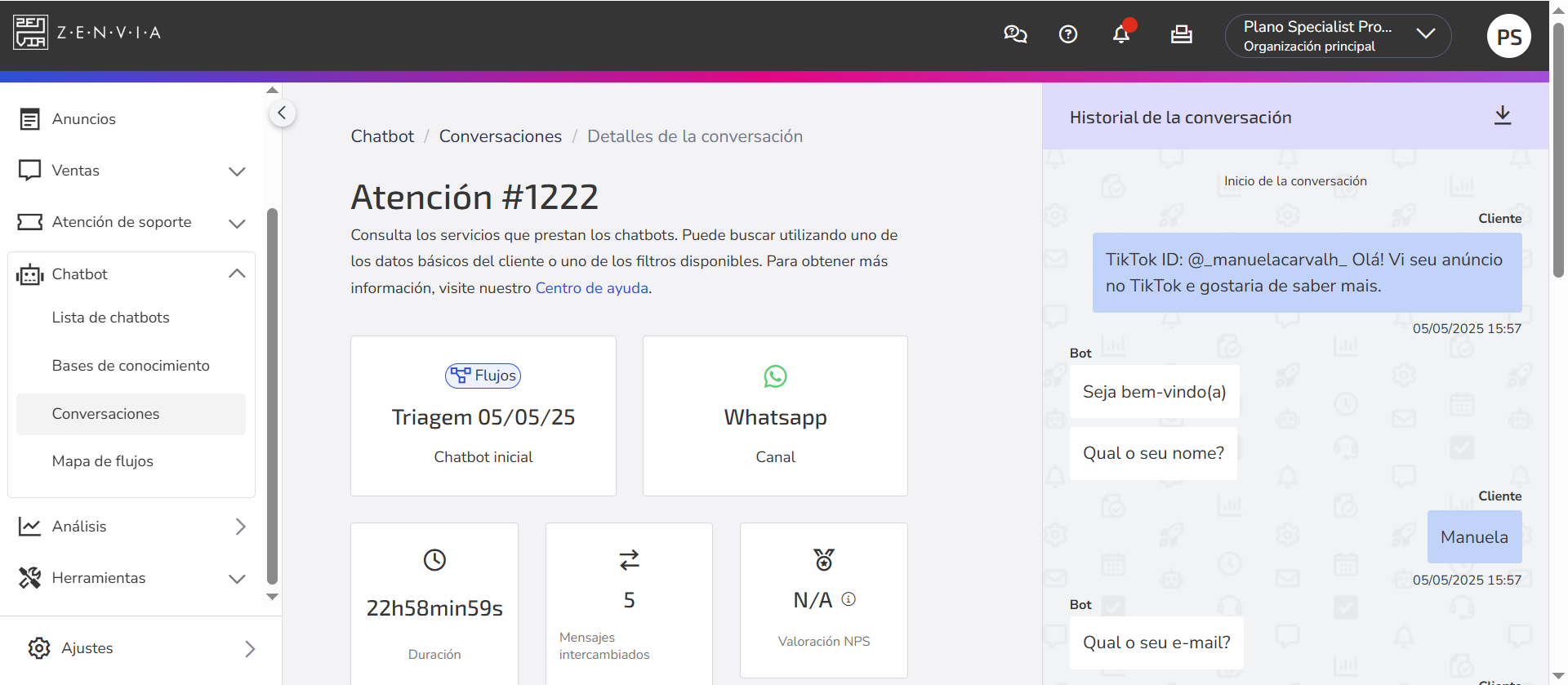 - Si el número de WhatsApp utilizado en la campaña está vinculado a un chatbot, los mensajes se registrarán automáticamente en Chatbot > Conversaciones. Para visualizar, solo hay que buscar el contacto y abrir la conversación. En el historial se mostrará el TikTok ID del contacto.