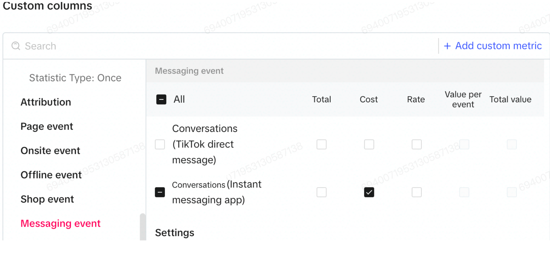 - También puedes acceder a Columnas personalizadas (Custom columns) > Evento de mensaje (Messaging Event). Selecciona Conversaciones (aplicación de mensajería instantánea) - Conversations (Instant messaging app) - para analizar el rendimiento.