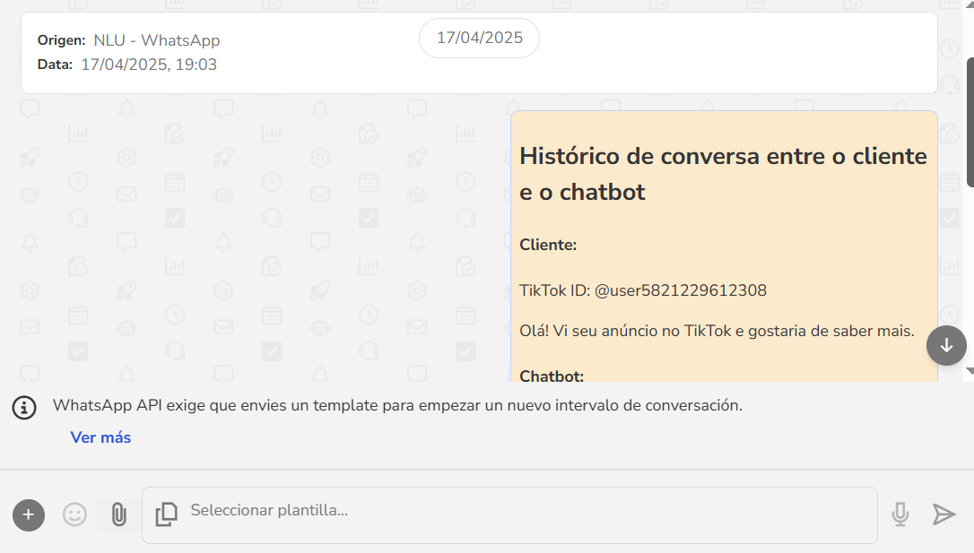 - Si el número de WhatsApp utilizado en la campaña está vinculado a un chatbot, los mensajes se registrarán automáticamente en Chatbot > Conversaciones. Para visualizar, solo hay que buscar el contacto y abrir la conversación. En el historial se mostrará el TikTok ID del contacto.