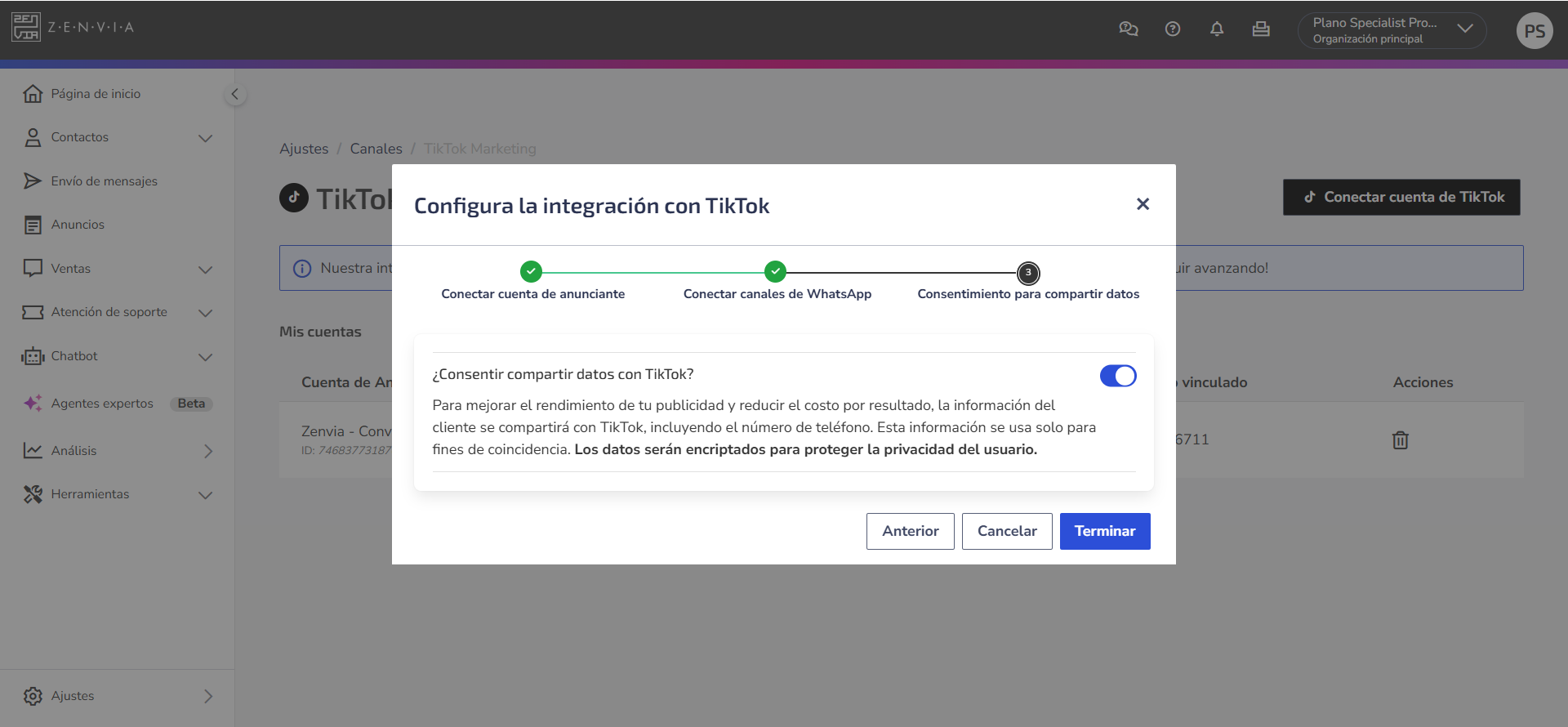 - Número de WhatsApp vinculado a la página de TikTok y registrado en Zenvia Customer Cloud.