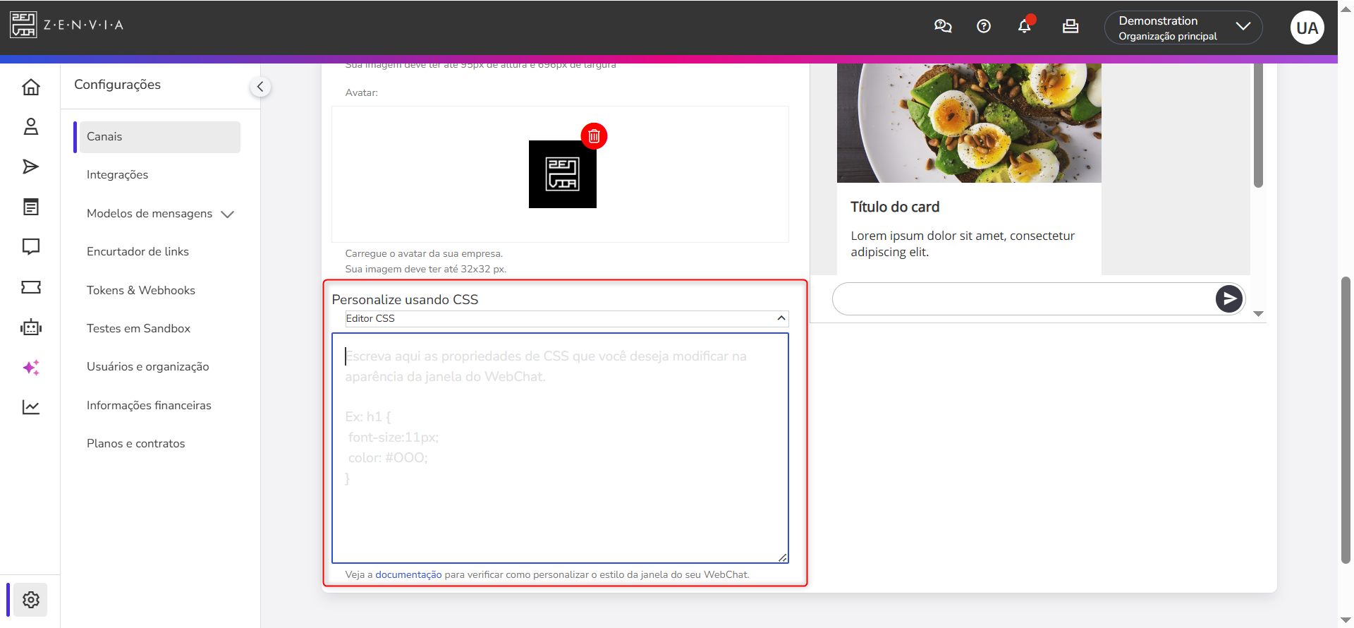 El Editor de CSS disponible en la configuración de apariencia del canal Web Chat permite personalizaciones avanzadas en la interfaz de la ventana de chat. Está recomendado cuando los ajustes estándar (como color, avatar y logo) no cumplen con los requisitos del proyecto, ya sea por necesidades del negocio o criterios visuales.