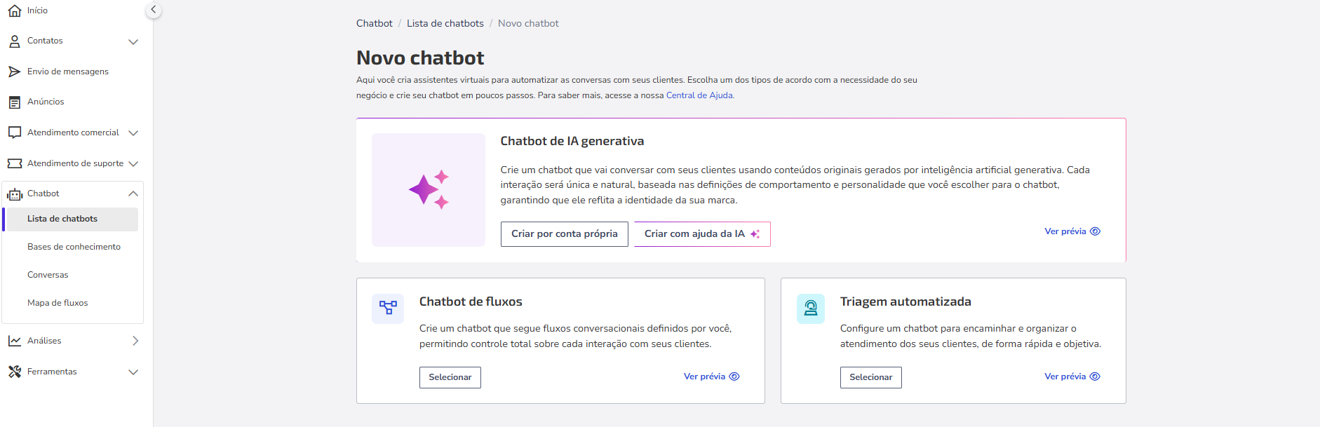 3.Pulsa en Seleccionar en la opción Chatbot de flujos.