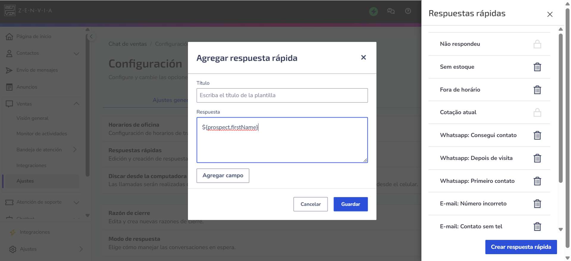 - Al crear una respuesta rápida, puede insertar variables ya disponibles en la configuración de ventas.